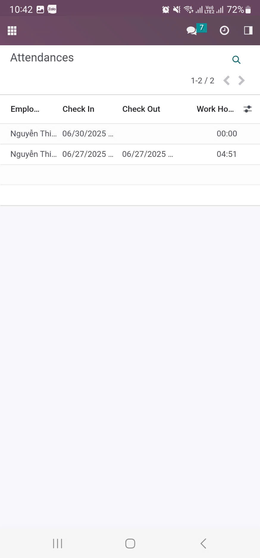 Bước 3: Truy cập vào module "Chuyên Cần" En "Attendances" Sẽ thấy được dữ liệu chấm công "Người dùng có thể xoay ngay màn hình để xem đầy đủ thông tin"